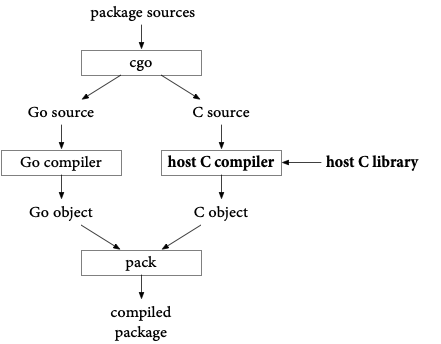 the Go toolchain compiles it using the local system’s C toolchain and caches that result.